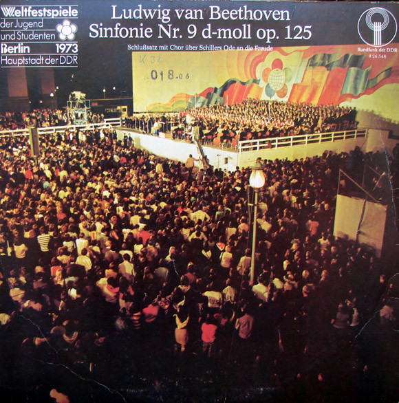 Cover-Rückseite der Weltfestspiel-LP des Rundfunks der DDR mit Angela Davis’ Ansprache auf der A-Seite und auf der B-Seite dem Schlusssatz von Beethovens 9. Sinfonie, VEB Deutsche Schallplatten/Eterna 826548, DDR 1973